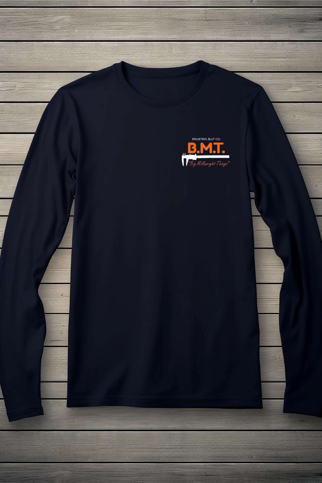 Smaller logo, same big attitude. This shirt makes a clear "Big Millwright Things" statement. Our smaller BMT logo design measures 4.25" long by 2.5" high.